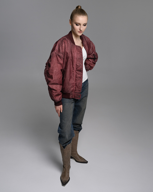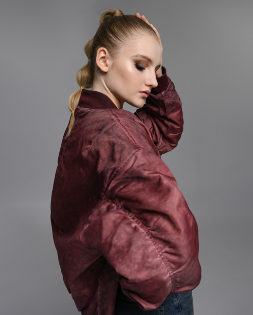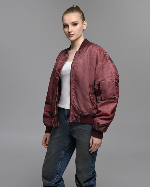 Куртка-бомбер с винтажным эффектом бордового цвета.