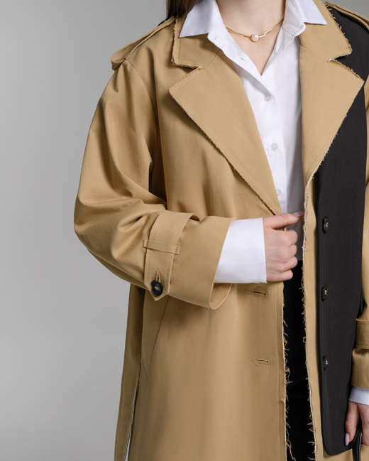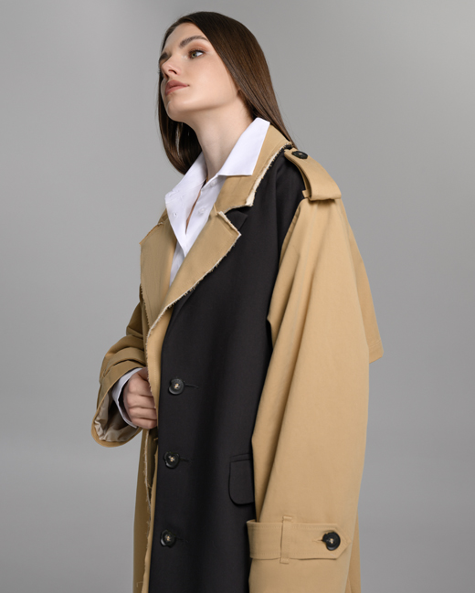 Однобортный тренч с вставкой из костюмной ткани, имитирующей половину жакета, будто надетую сверху на тренч. Длинный силуэт оверсайз.