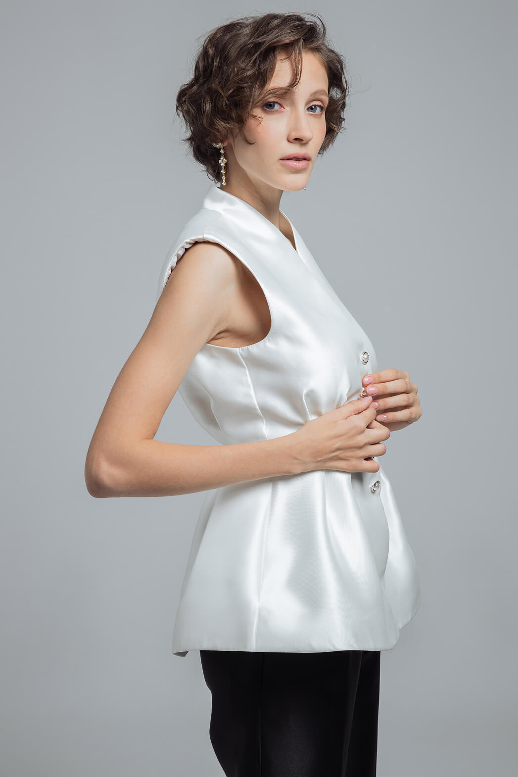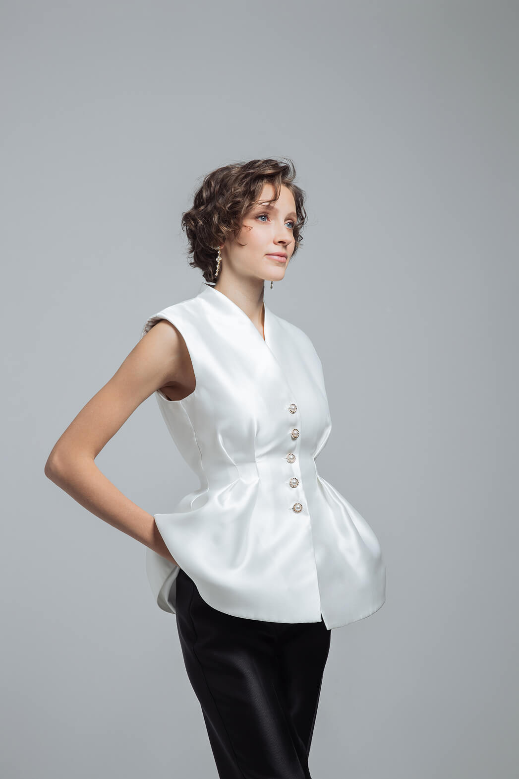 Атласный жилет с баской и жемчужными пуговицами