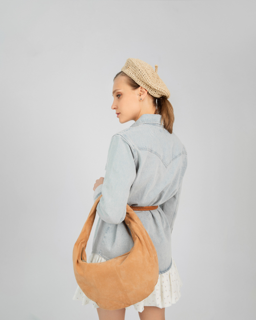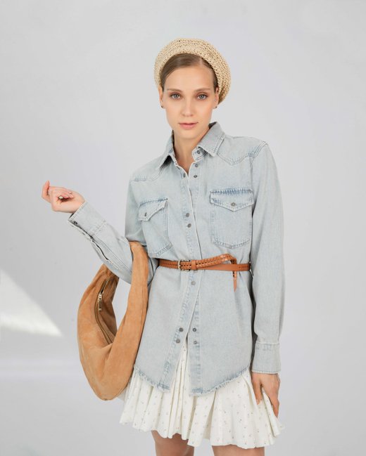 Джинсовая рубашка и казаки – маст хэв сезона! Удобно и романтично сочетать с легкой юбкой и вязаным беретом. Объемная сумка дополнит ваш образ и сделает его еще более утонченным.