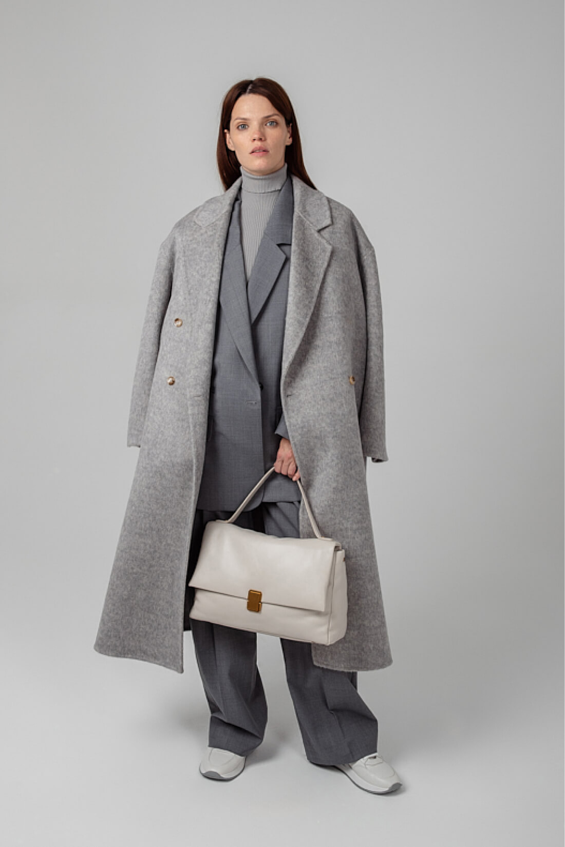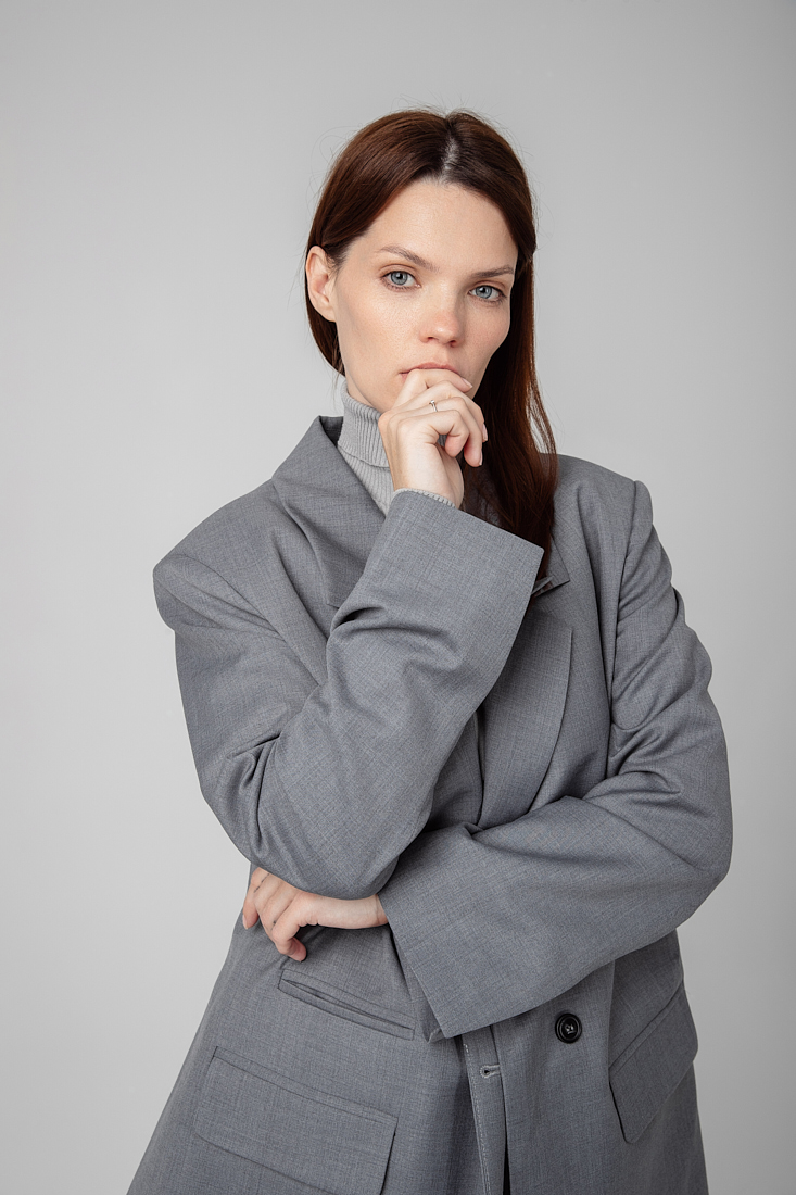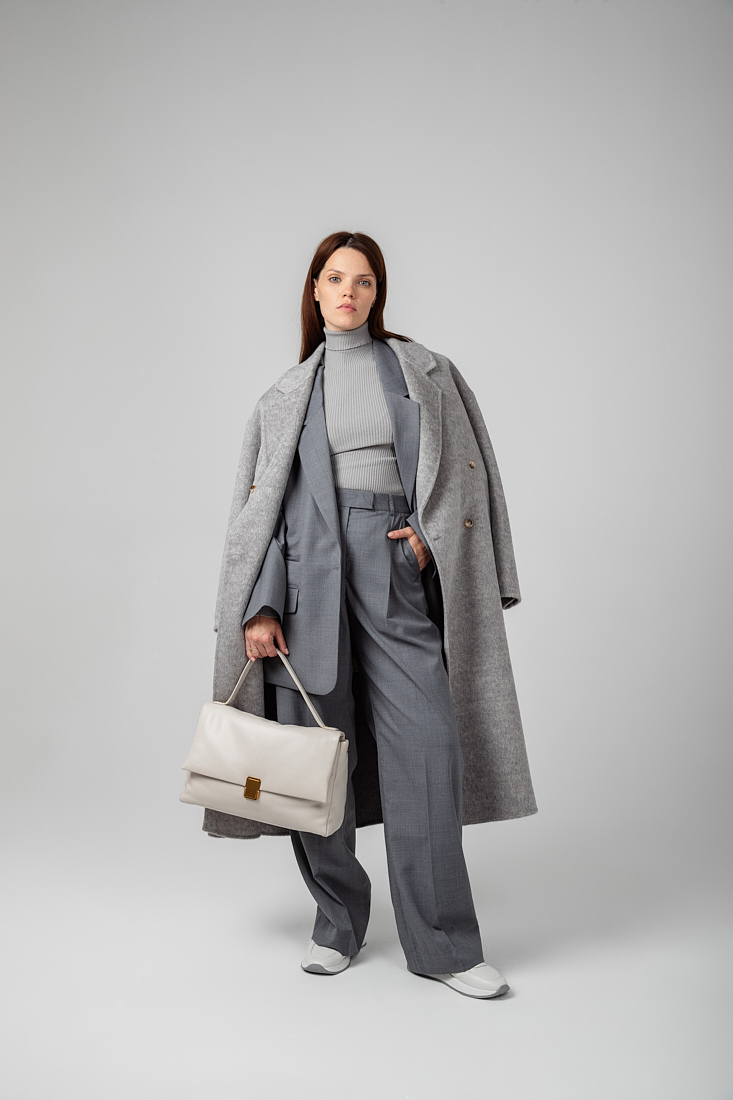 Образ с серым пальто и костюмом выглядит одновременно строго и изящно. Пальто подчеркнет женственность, а костюм добавит уверенности