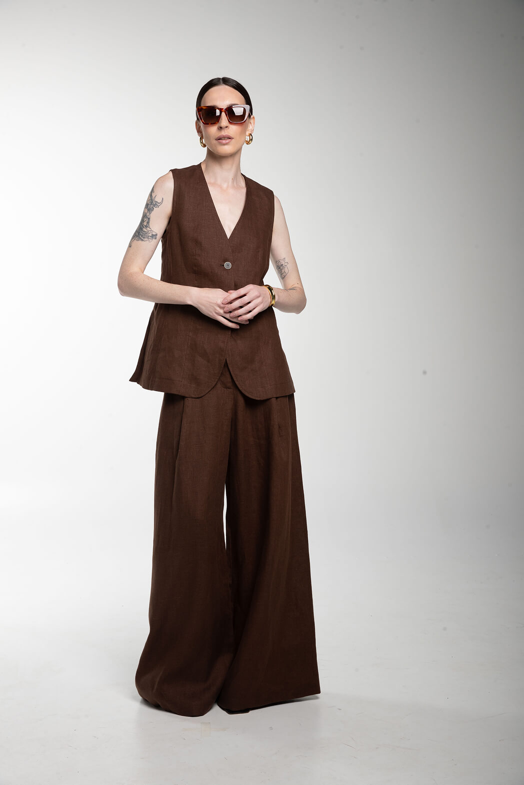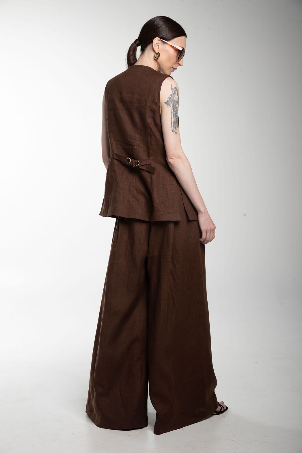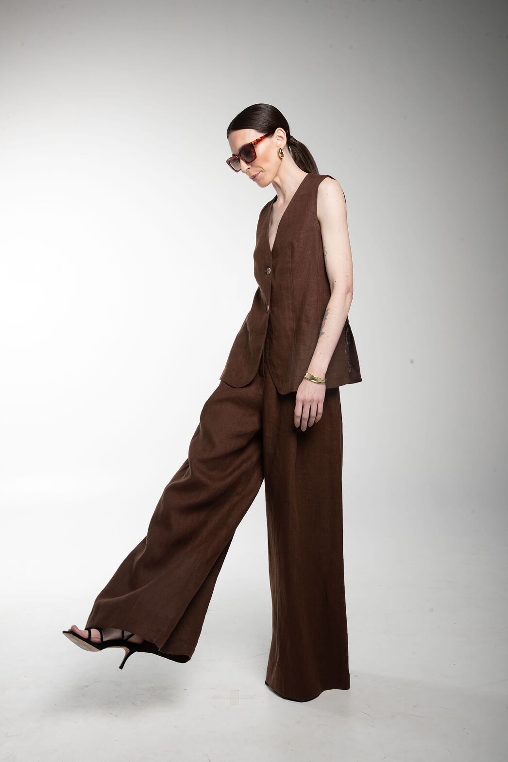 Образ в деловом стиле — монохром шоколадного цвета из удлиненного жилета и широких брюк, которые выполнены из 100% льна.