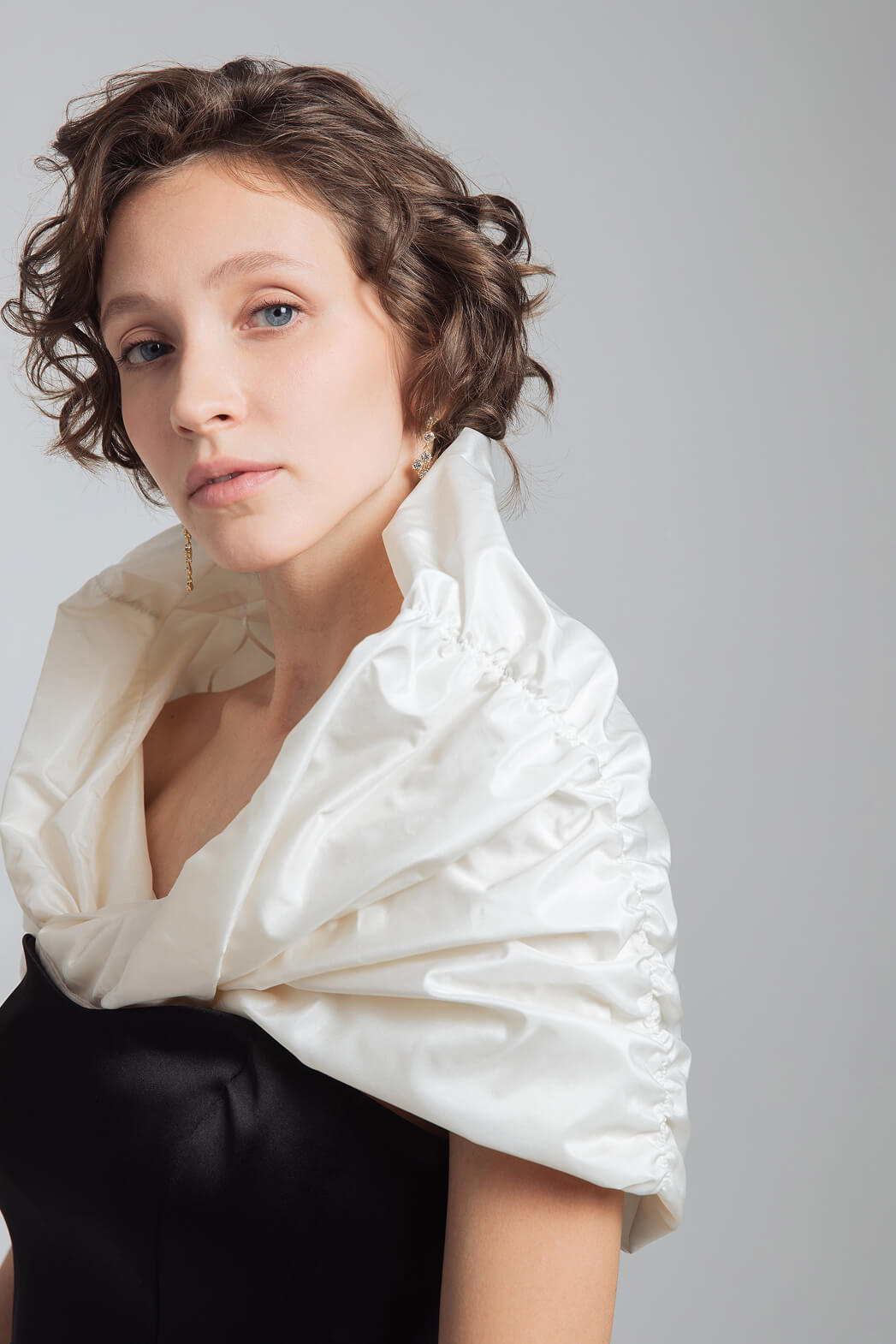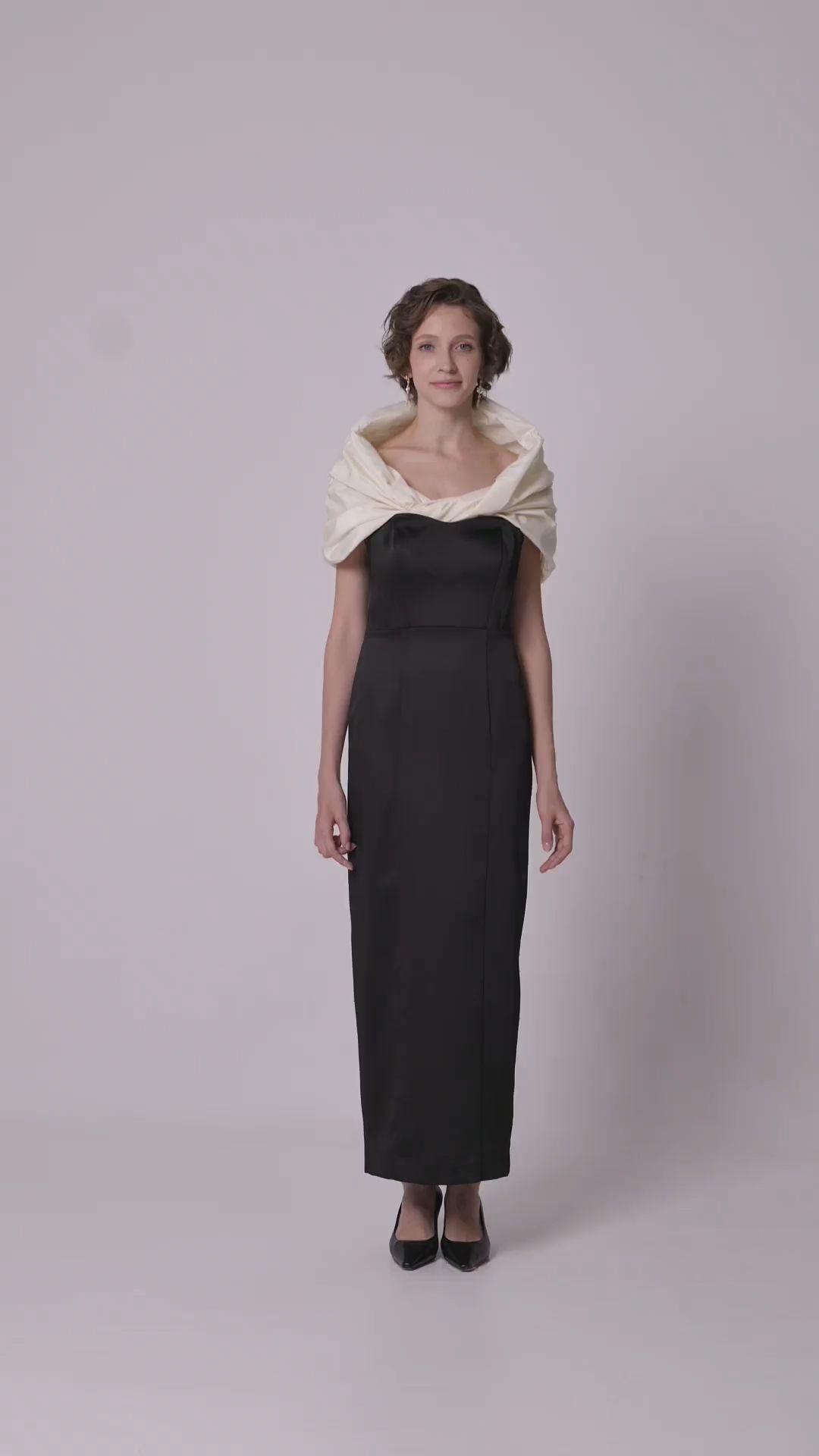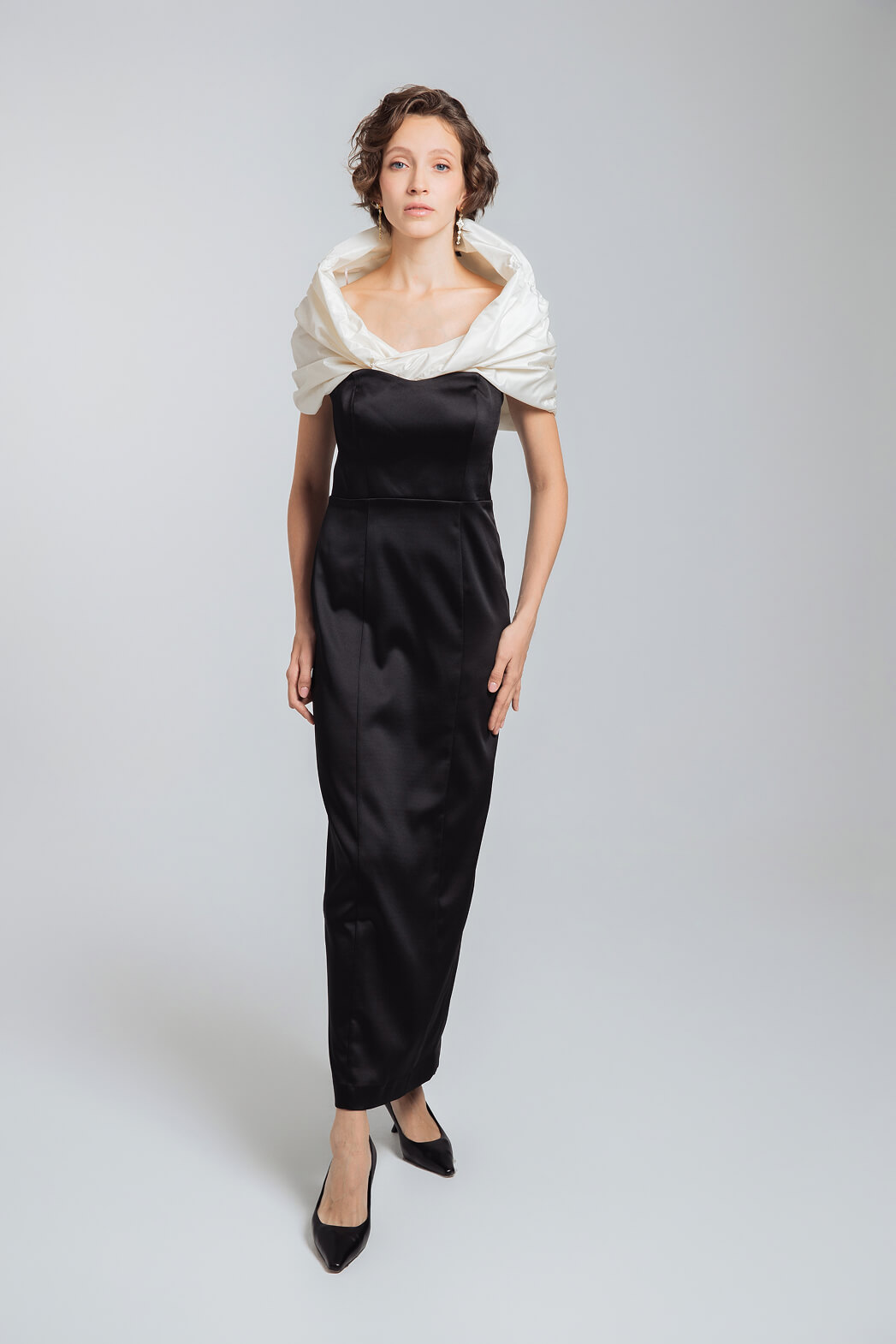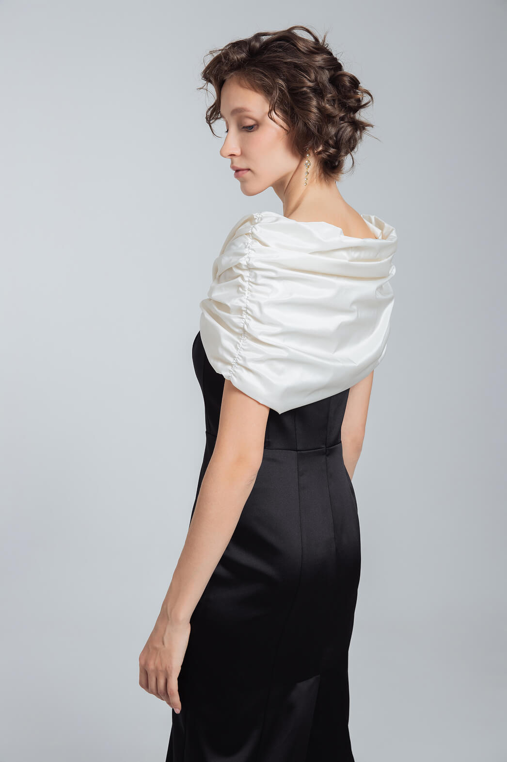 Вечерний образ с атласным платьем-футляром и эффектной пелериной из тафты