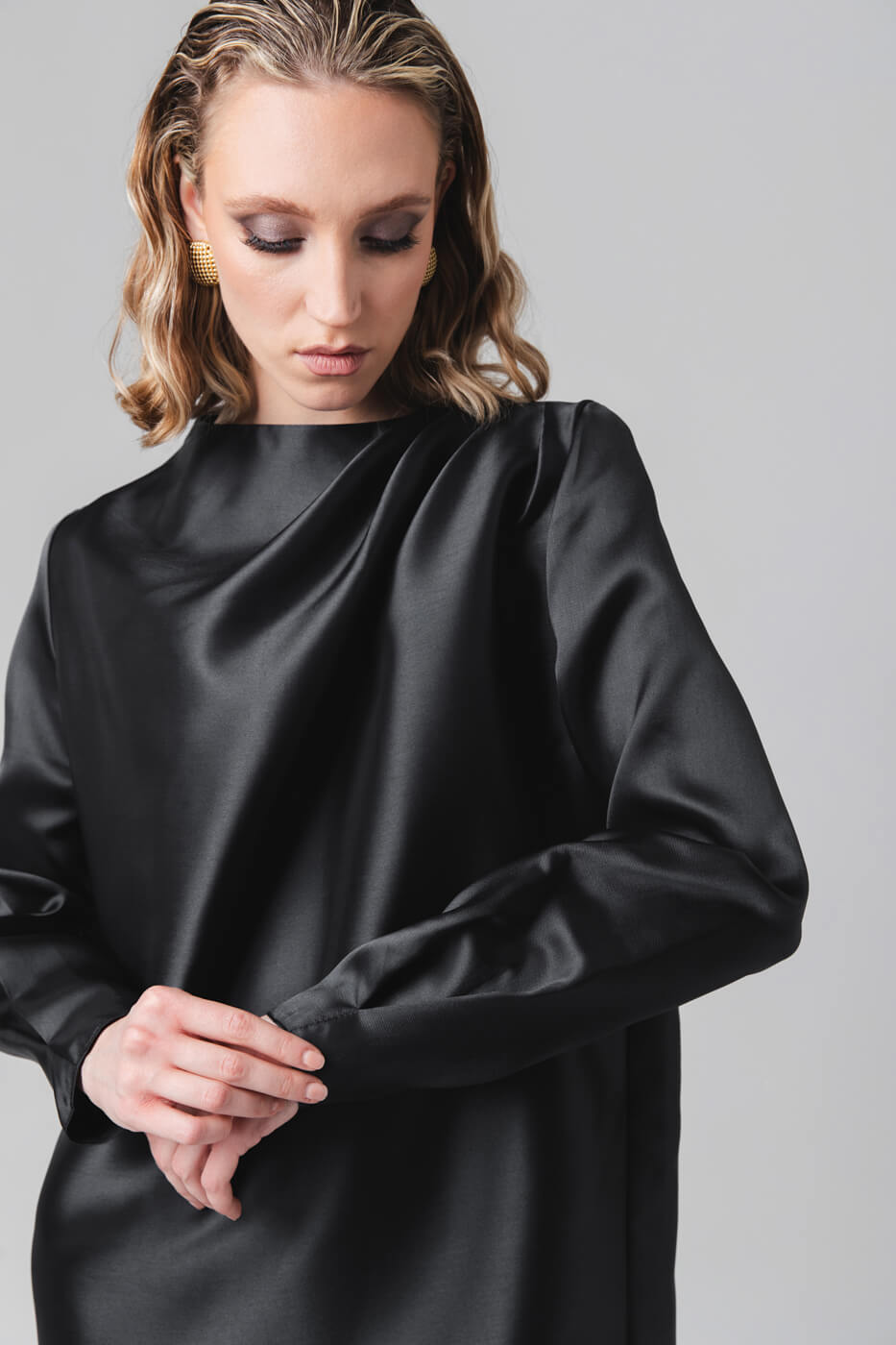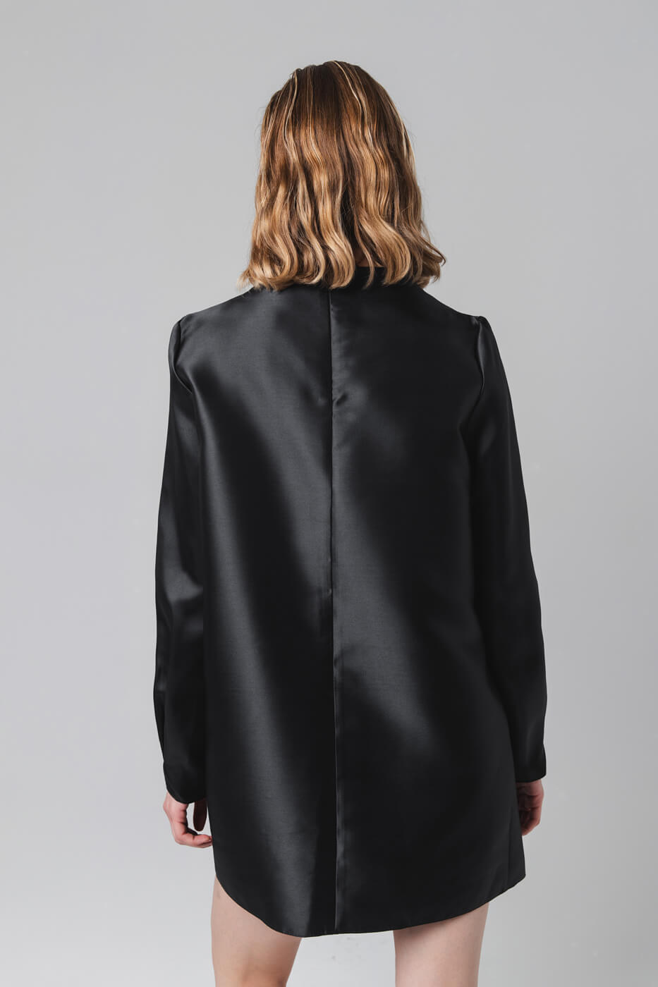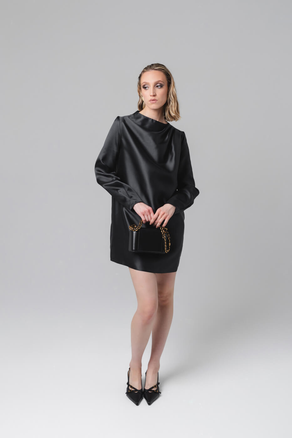 Черное мини-платье А-силуэта выглядит одновременно минималистично и роскошно