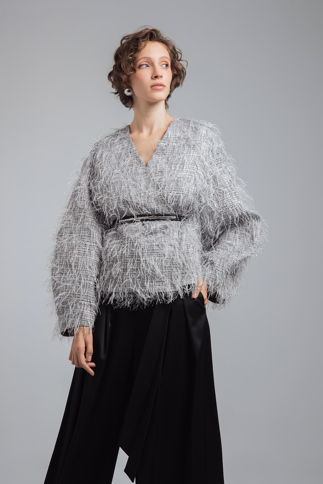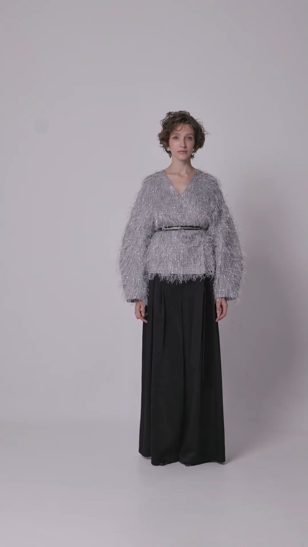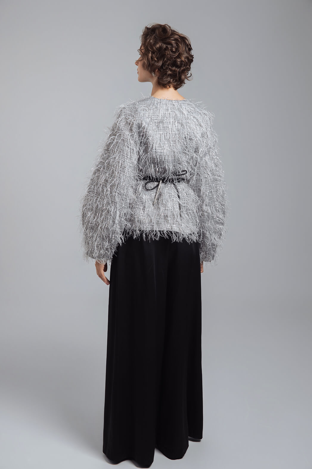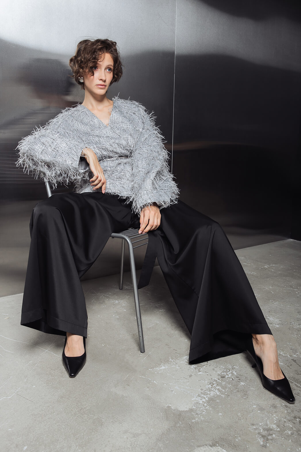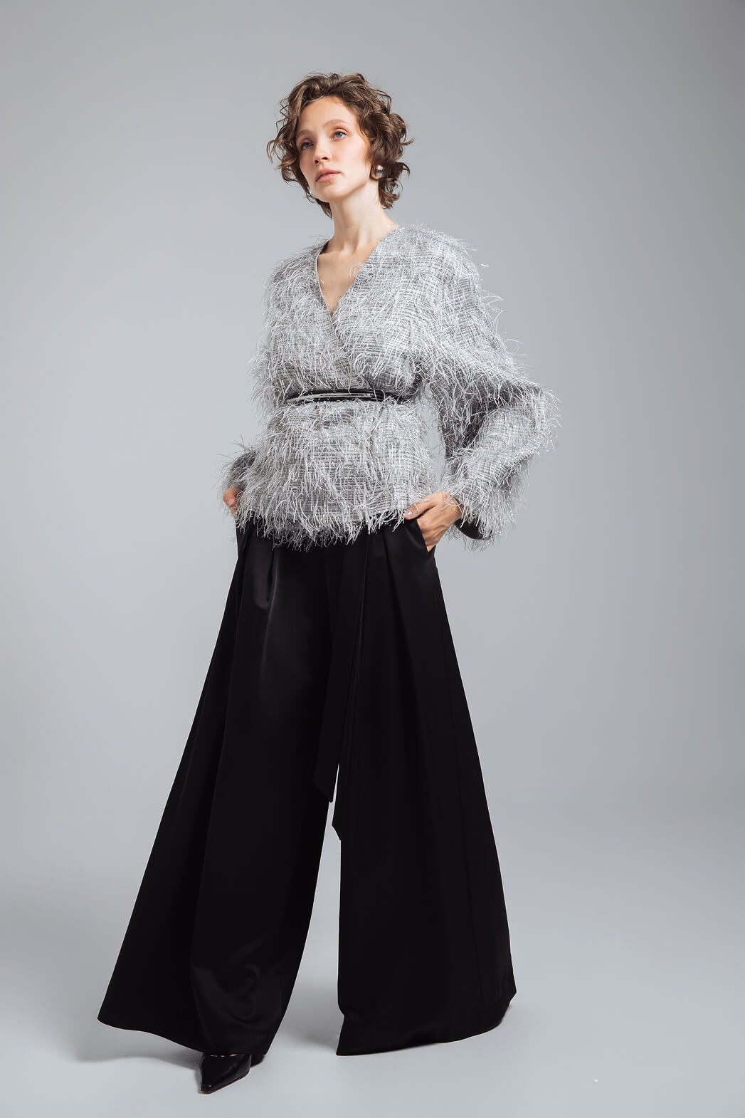 Вечерний образ с эффектным жакетом и широкими атласными брюками