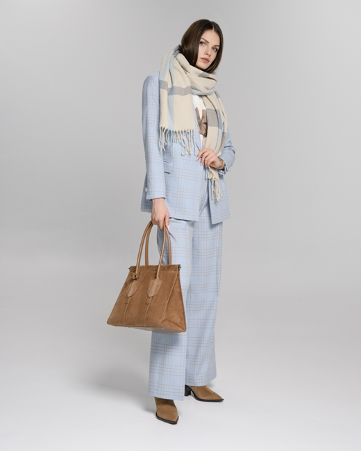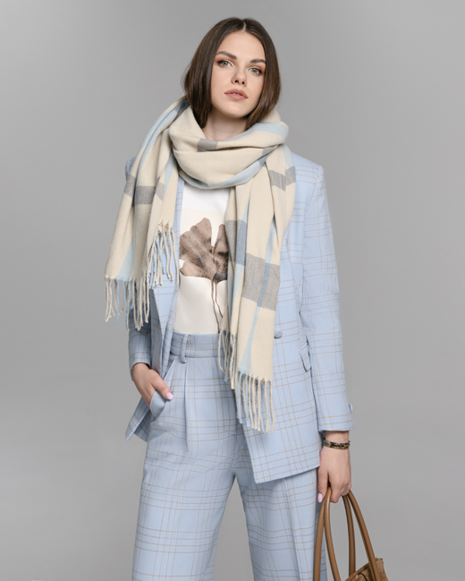 Классика бывает не скучной! Нежно-голубой костюм в клетку и футболка с принтом придают образу легкость, которая так необходима этой весной.
