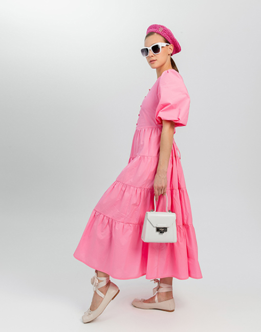 Волшебное летящее розовое платье для самых заядлых модниц. Приятный оттенок розового и туфли в балетном стиле гармонично дополняет вязаный берет и маленькая аккуратная сумочка. Романтика да и только.
